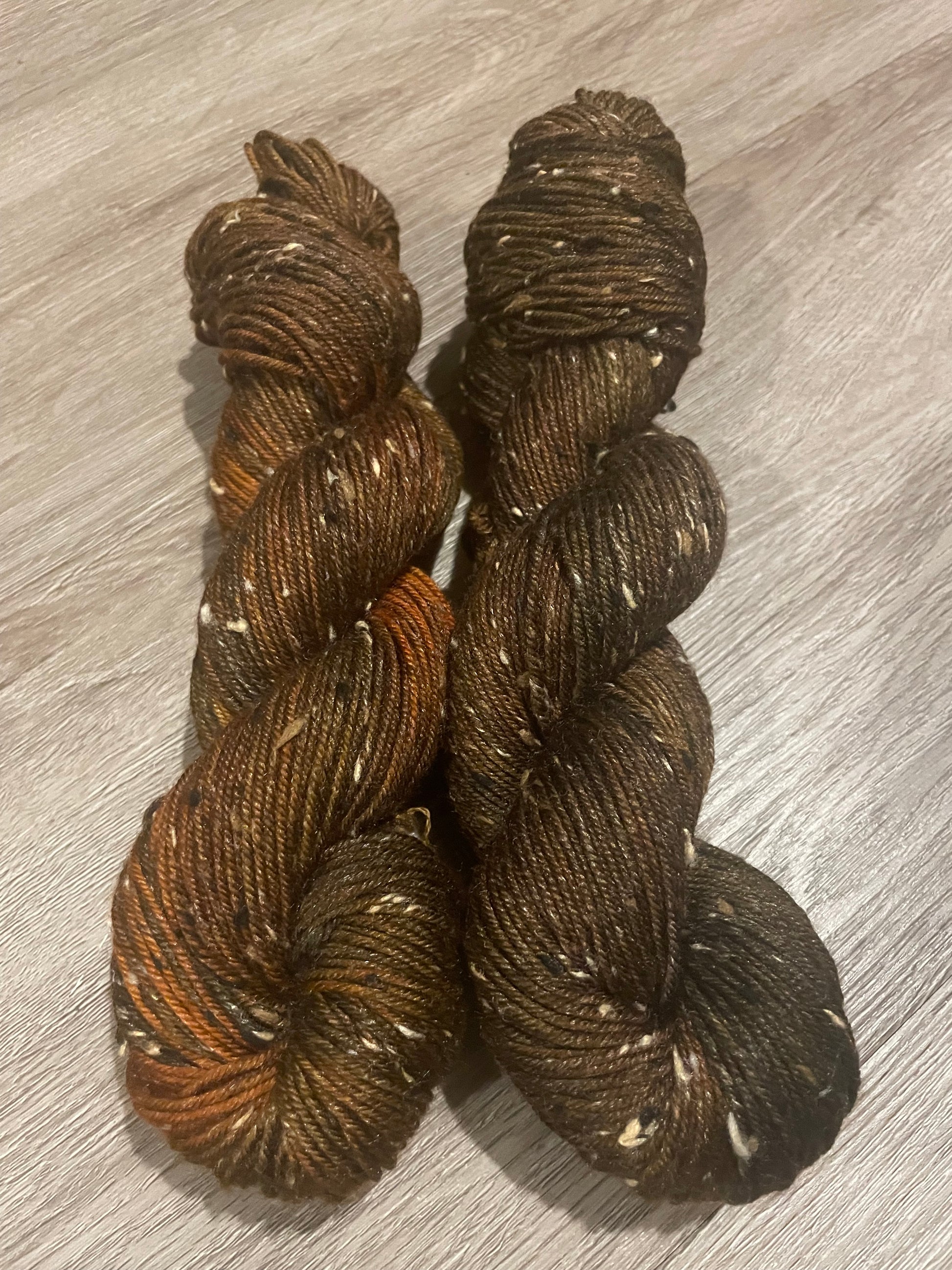 This colourway whispers of ancient groves and forest floors after rain: soft, earthy, and full of depth. The understated green undertones peek through the browns like moss between tree roots, giving your stitches a rich complexity and calm strength.