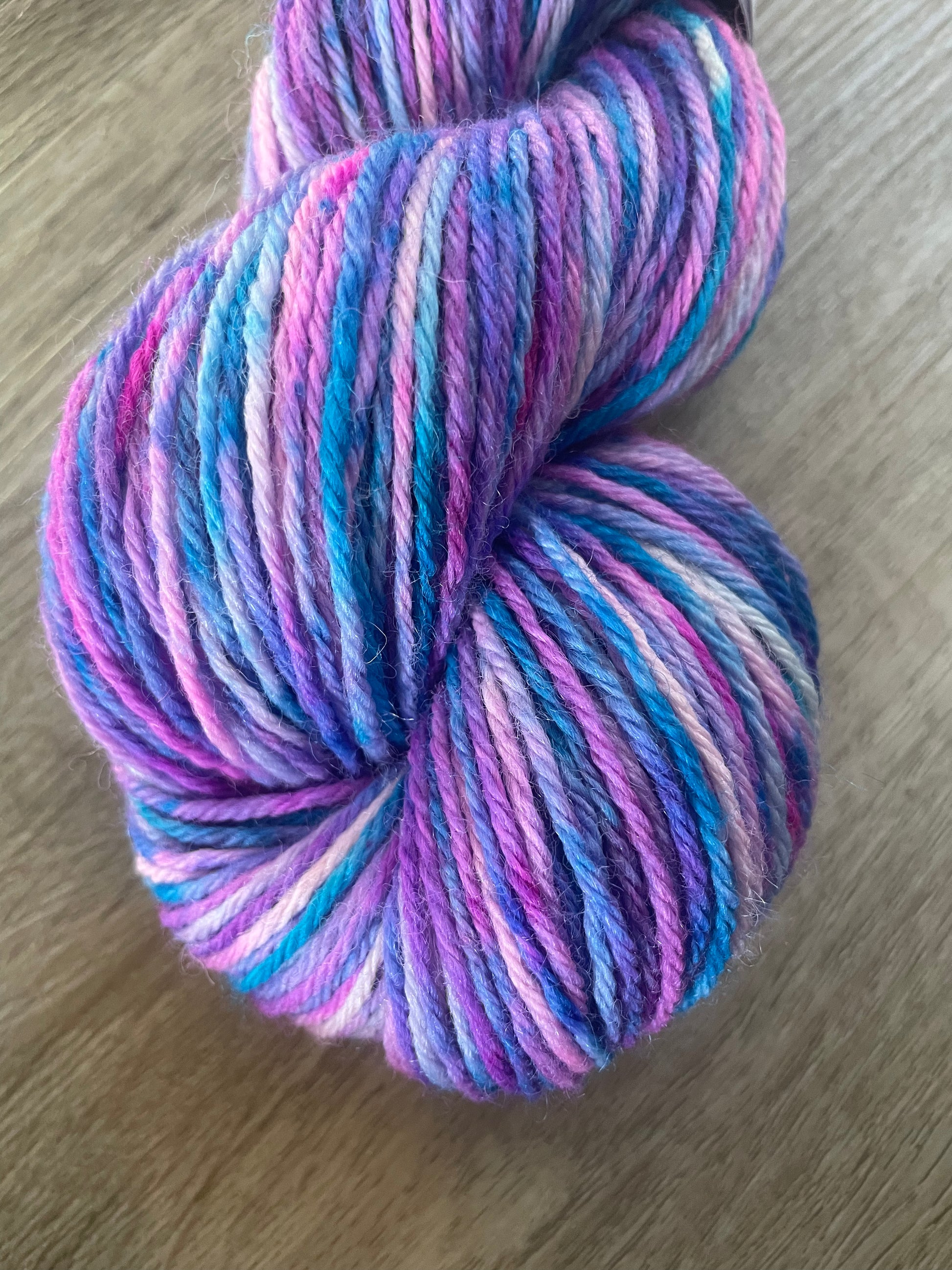 Prism is a vibrant splash of light, a yarn that captures the full spectrum of a rainbow in a single skein. It’s a playful mix of bright magenta, sky blue, periwinkle, and pale pink, all dancing together in a stunning display of colour. This yarn is like a magical sunset and a shimmering unicorn all wrapped into one, ready to add a little bit of whimsy to your next project. It’s perfect for creating something that’s as unique and colourful as you are!