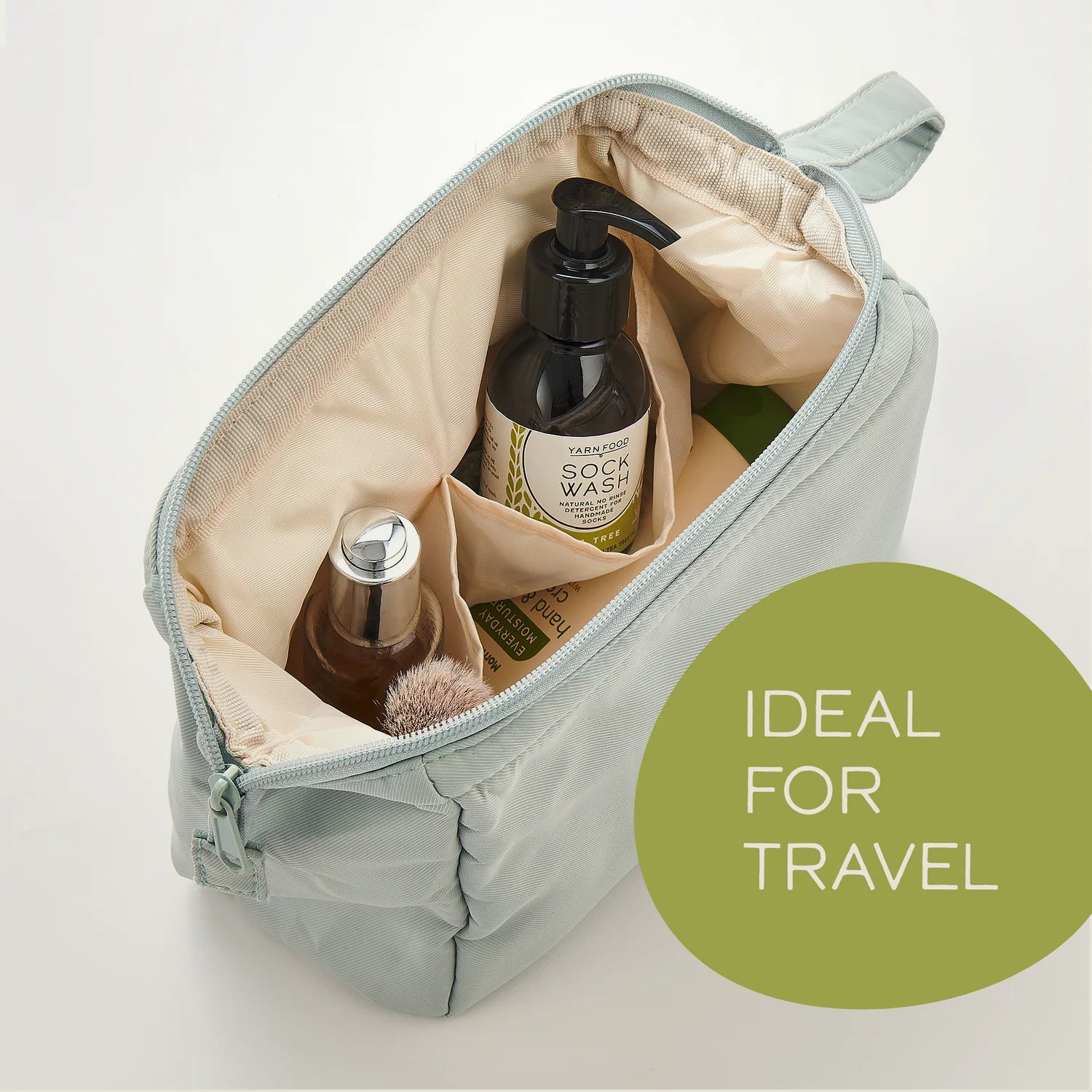 PERFECT TRAVEL DETERGENT Made to fit in your wash bag, just add 3 pumps of Yarn Food’s hand wash liquid for knitters to a water-filled sink wherever you are, leave 20 minutes to soak, squeeze out water, lay out flat or hang to dry. No machine or effort needed. You’re on holidays after all.
